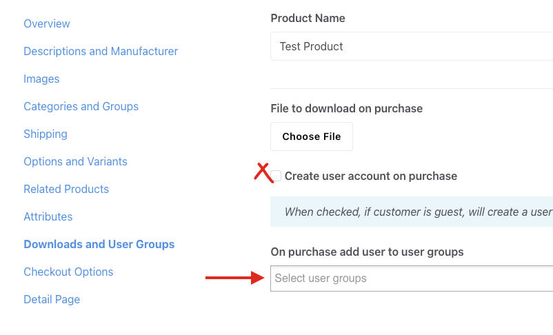 To make a product require a login, what you need to do is assign at least one user group to the product here, but, not check the ‘Create user account on purchase’ checkbox.
