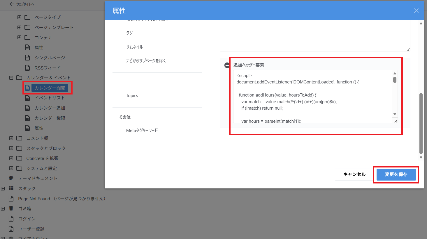 I went to “Admin Panel” → “Sitemap” → “Include System Pages in Sitemap” → “Calendar and Events” → “Calendar Viewing” → “Attributes” → “Additional Header Element” and added all the code, then saved the changes.