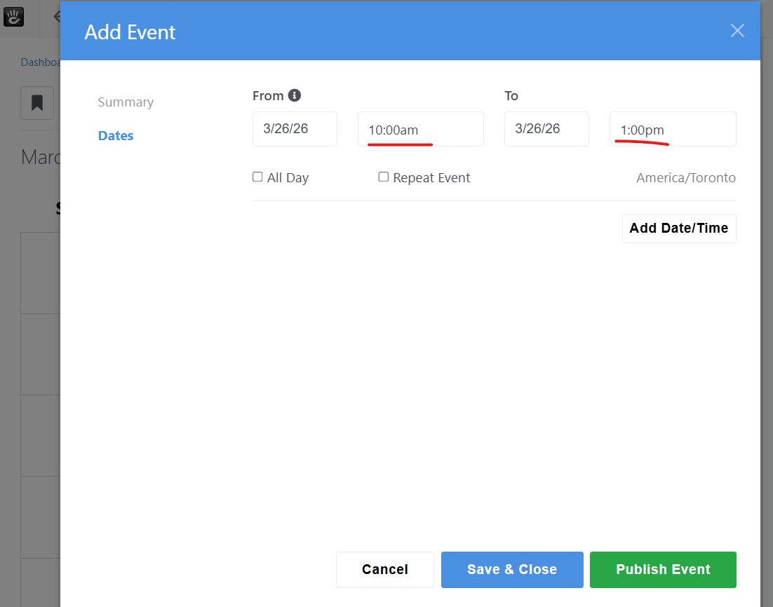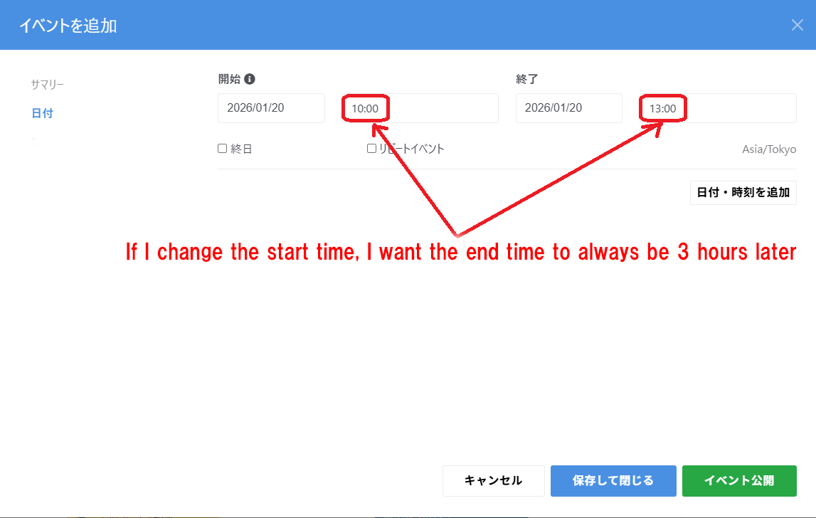 I spent a little time chatting with ChatGPT about this and here’s what ‘we’ came up with. Go to the Dashboard → Sitemap and choose “Show system pages” in the options (top right). Then expand Calendars and Events and click on View Calendar and choose “Attributes”. Then add “Extra header content” and put the JavaScript below into that box and save. Don’t add any comments to this JavaScript because concrete likes to try to clean up stuff and comments seem to truncate the script. I’m not exactly sure what behavior you are looking for but this script defaults to 3 hour and if you change the start time, it populates the end time 3 hours later. You are then free to change the end time as you see fit but if you go back and change the start time again, it will insert a 3 hour end time again.