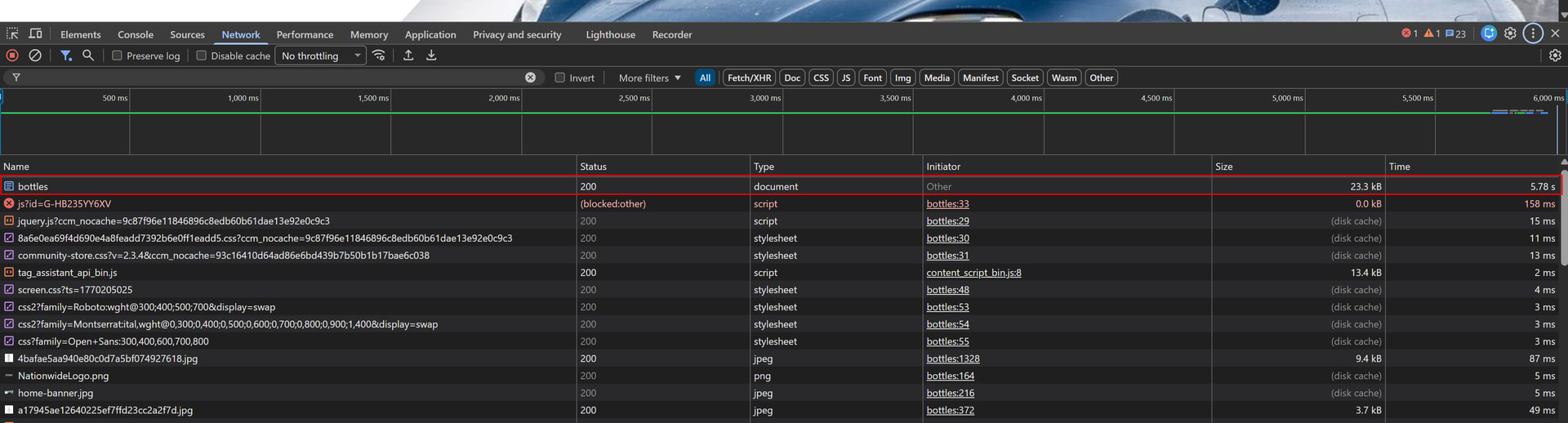 It’s not down to page assets, it’s a slow TTFB / server response time, so you just see it on the first line: