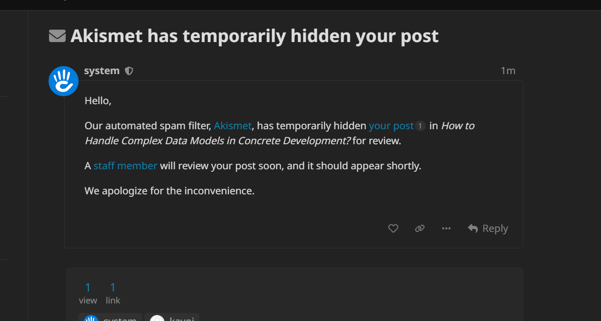 I recently posted a query on this forum, But now it is showing this error- “ Our automated spam filter, Akismet, has temporarily hidden your post https://forums.concretecms.org/t/how-to-handle-complex-data-models-in-concrete-development/9377/1 for review.” Could you please suggest me guidance why it is showing?